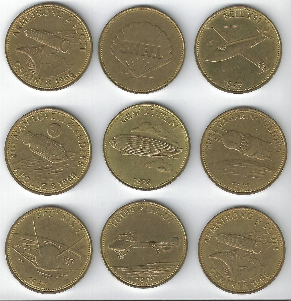 Seltenes Fundstück! 9x Shell Münzen Eroberung des Himmels, Ø Münze: 2,5 cm, sehr guter Zustand.
