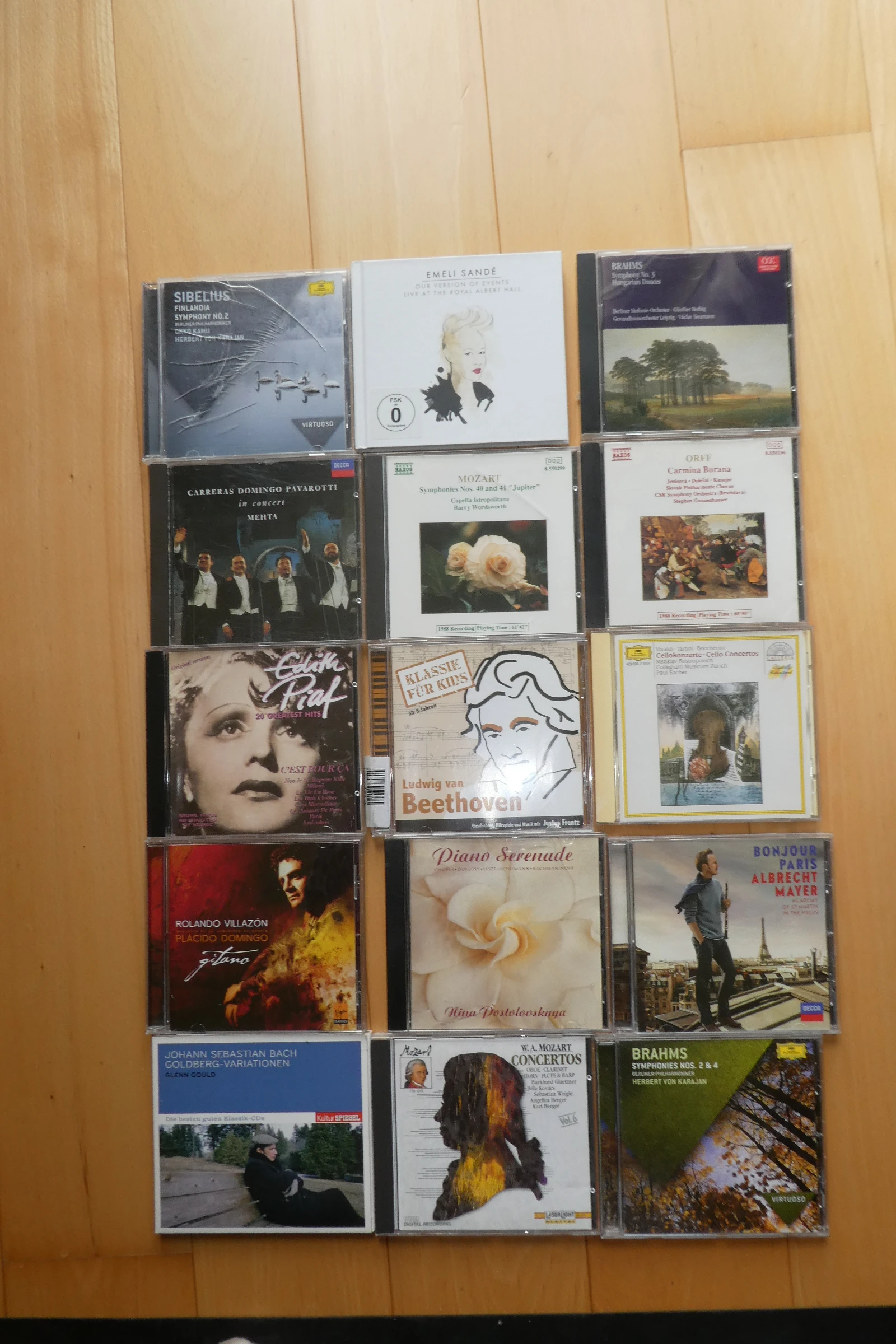 Sie bieten auf 15 CD's Klassik u.a. BRAHMS SYMPHONIES NOS 2 & 4 BONJOUR PARSI ALBECHT MAYER MOZART CONCERTOS VOL.6 PIANO SERENADE JOHANN SEBASTIAN BACH GOLDBERG-VARIATIONEN LUDWIG VAN BEETHOVEN KLASSIK FOR KIDS CELLOKONZERTE VIVALDI TARTINI BOCCERINI ROLANDO VILLAZON PLACIDO DOMINGO EDITH PIAF 20 GRETEST HITS MOZART SYMPHONIES NOS 40 and 41 JUPITER CARMINA BURANA BRAHMS SYMPHONY No.3 EMELI SANDÉ OUR VERSION OF EVENTS CARRERAS DOMINGO PAVAROTTI MEHTA SIBELIUS FINLANDIA SYMHONY NO. 2 NUR 15 Euro