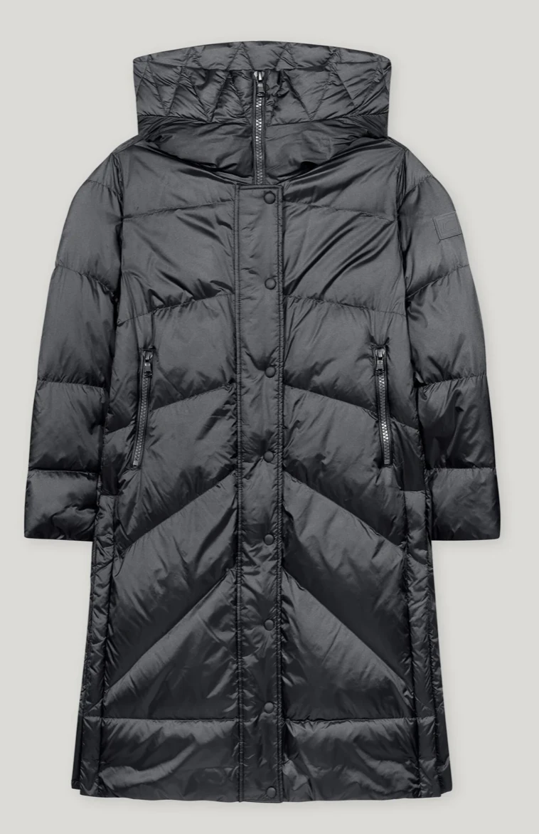 Warmer, gesteppter Daunenmantel mit fester Kapuze, verdecktem Zwei-Wege-Frontreißverschluss und zwei seitlichen Reißverschlusstaschen in Größe 46 und der Farbe midnight blue. Der Saum ist seitlich hoch geschlitzt und mit einer Druckknopfleiste ausgestattet. Obermaterial und Futter: 100% Polyamid