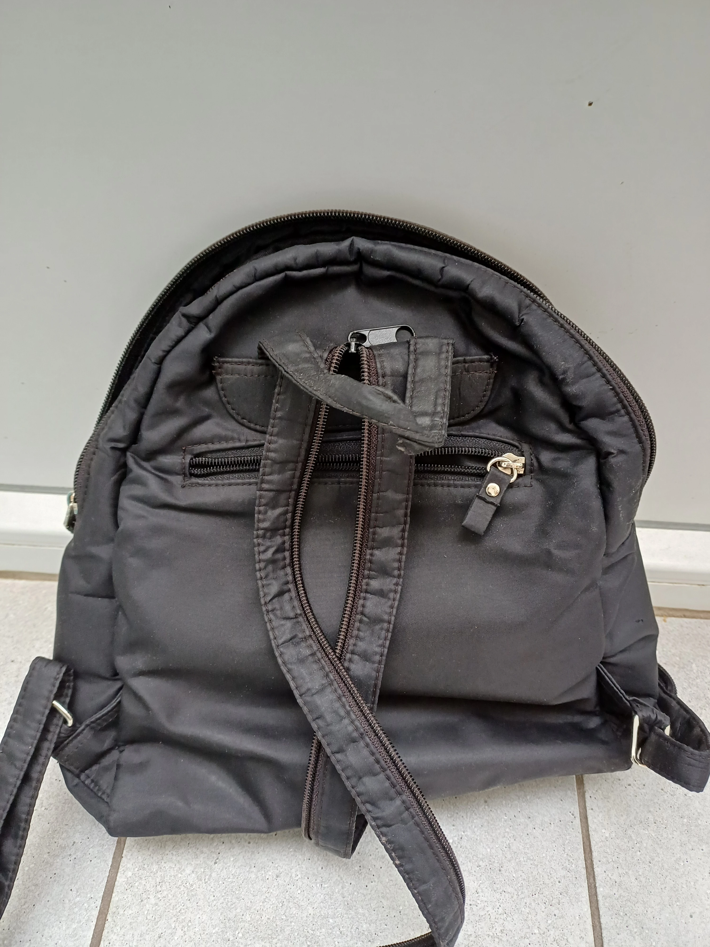 Durch einem Reissverschluss dahinten entweder als kleiner Rucksack oder eine Tasche benutzbar.