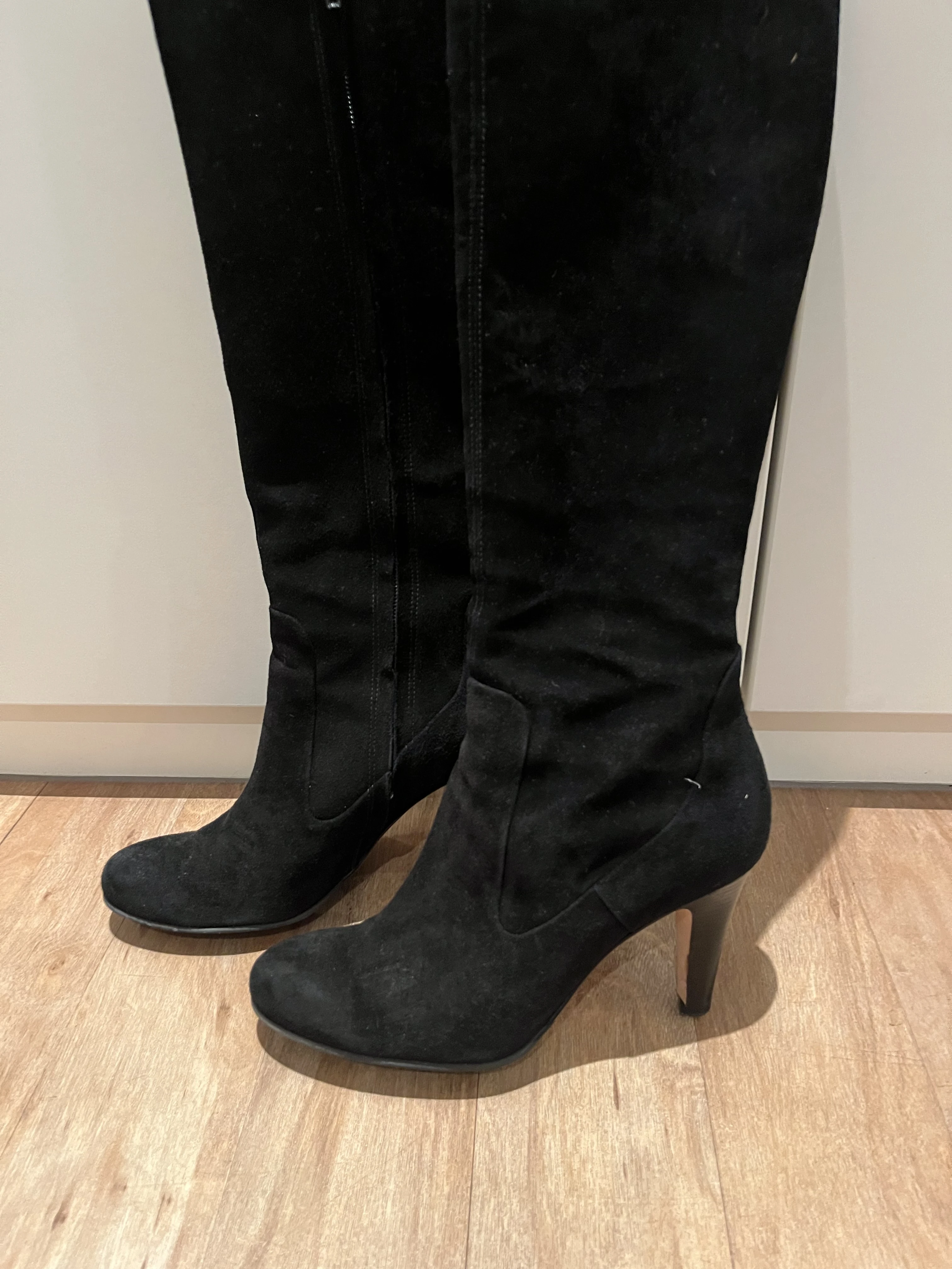 1. Schwarze Wildstiefel von Buffalo hoher Schaft, Absatzhöhe 9 cm, nicht getragen mit Originalkarton.