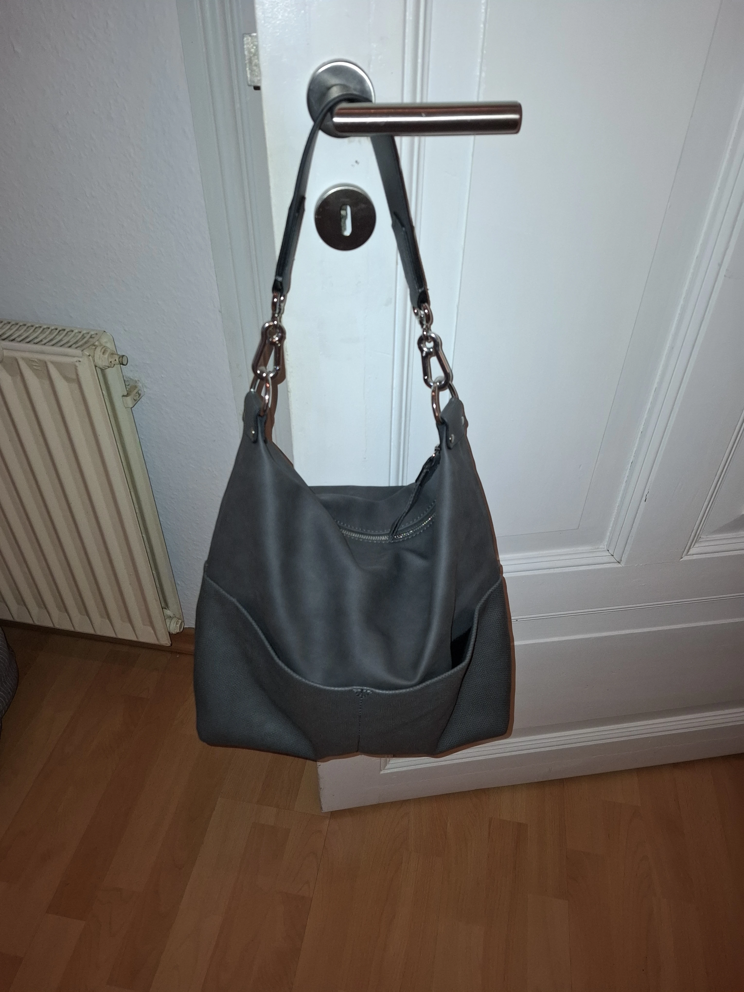 Handtasche von Esprit, Kunstleder, fast wie neu,da kaum gebraucht. Maße: 40cm breit, 30cm hoch, 10cm tief, Farbe grau. Die Tasche hat 2 Aussenfächer, 1Fach innen mit Reißverschluss und eine Handytasche.