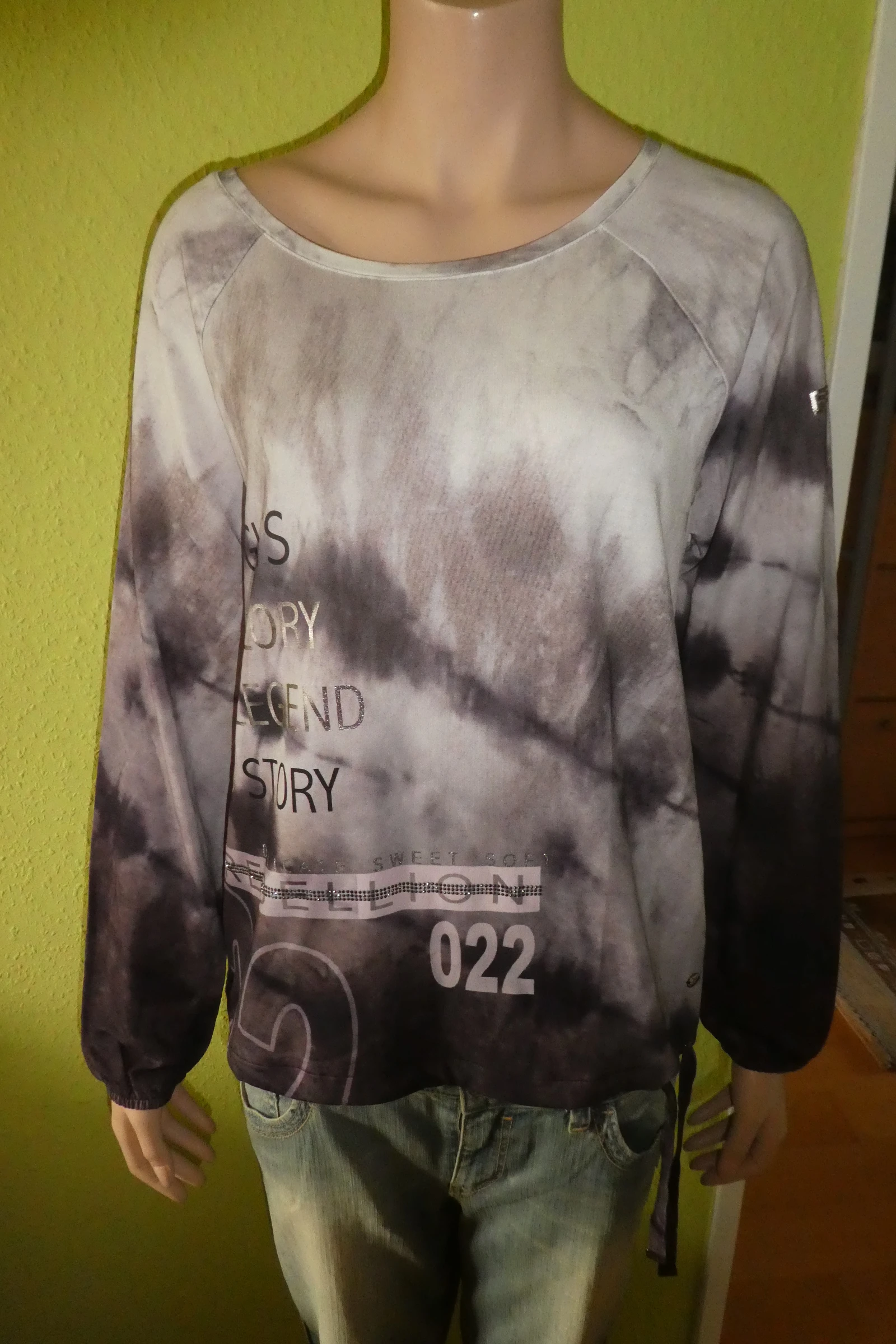 NEU NEU NEU mit ETIKETT Neupreis 99.99 Euro MONARI Langarmshirt mit Aufschrift Gr. 38 Material: 45 % Viskose 45 % Modal 10 % Elasthan Hier die Maße: Breite ca. 52 cm Länge ca. 61 cm Ärmellänge ca. 67 cm von oben an NUR 45 Euro