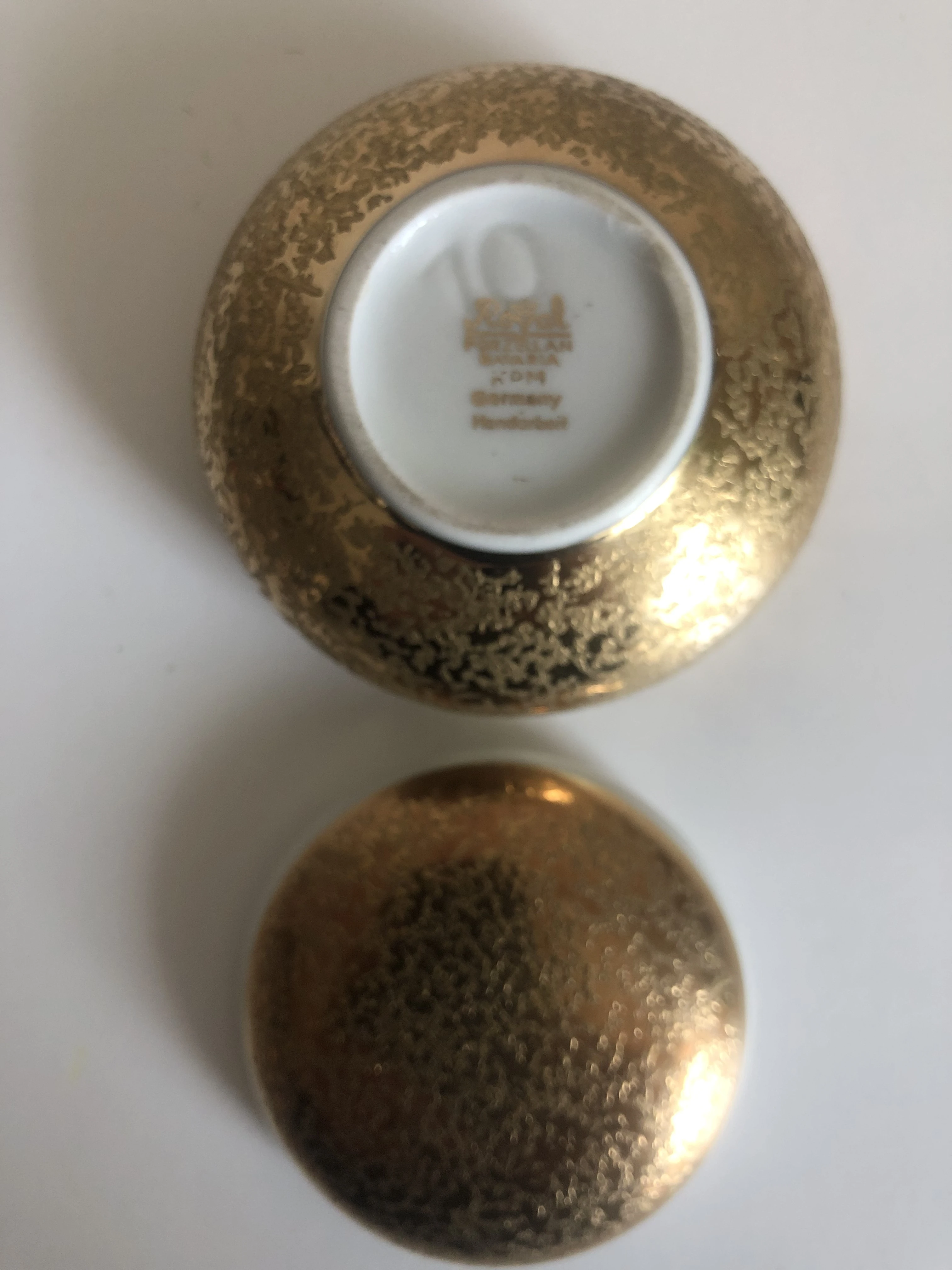 Bavaria KPM - Seltenes Fundstück! Diese handgemachte Deckeldose von der Porzellan Manufaktur Royal Bavaria KPM ist ein perfekter Behälter für kleine Gegenstände. Es würde auf Ihrer Kommode oder als Vitrinenstück wunderschön aussehen. Seit Jahrzehnten in Familienbesitz, wurde nie genutzt, sondern diente als Vitrinenobjekt, daher sehr guter Vintage Zustand. Keramik mit Golddekor, Material: Porzellan, Farbe: Gold/Weiß, Maße: Höhe 4,5 cm, Durchmesser 7,0 cm. Diese hochwertige Rarität sucht jetzt einen liebevollen Neubesitzer und ist ein tolles Geschenk. Privatverkauf, siehe Fotos, Tierfreier Nichtraucherhaushalt! jetzt nur 25€, Versand (€ 4,00) bei Kostenübernahme möglich