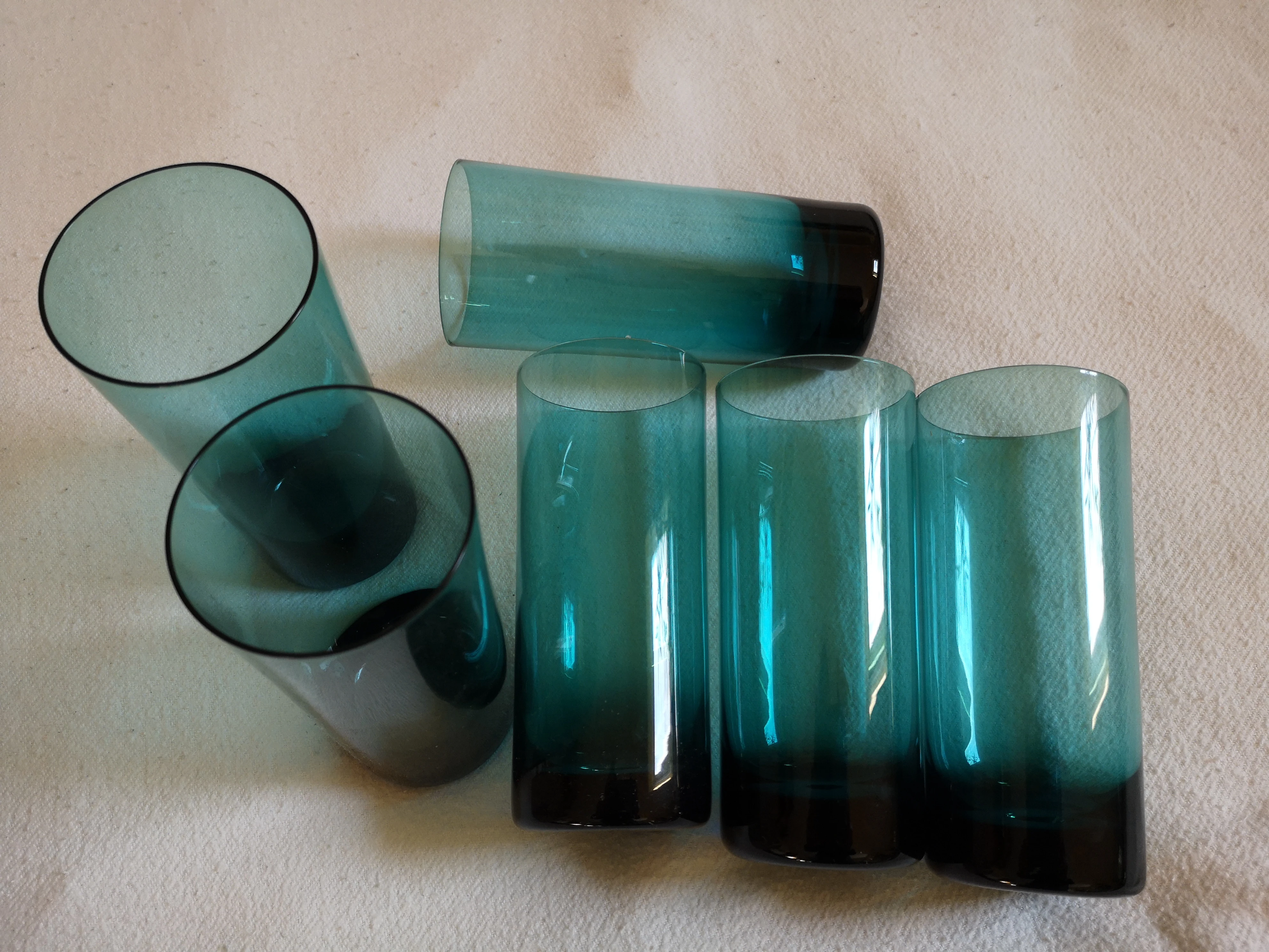 Ich verkaufe diese 6 blaugrünen Trinkgläser aus den 70er Jahren aus dem Bestand meiner Eltern. Absolut ohne Gebrauchsspuren, wie neu – siehe Bilder – nur Abholung in der Neustadt.