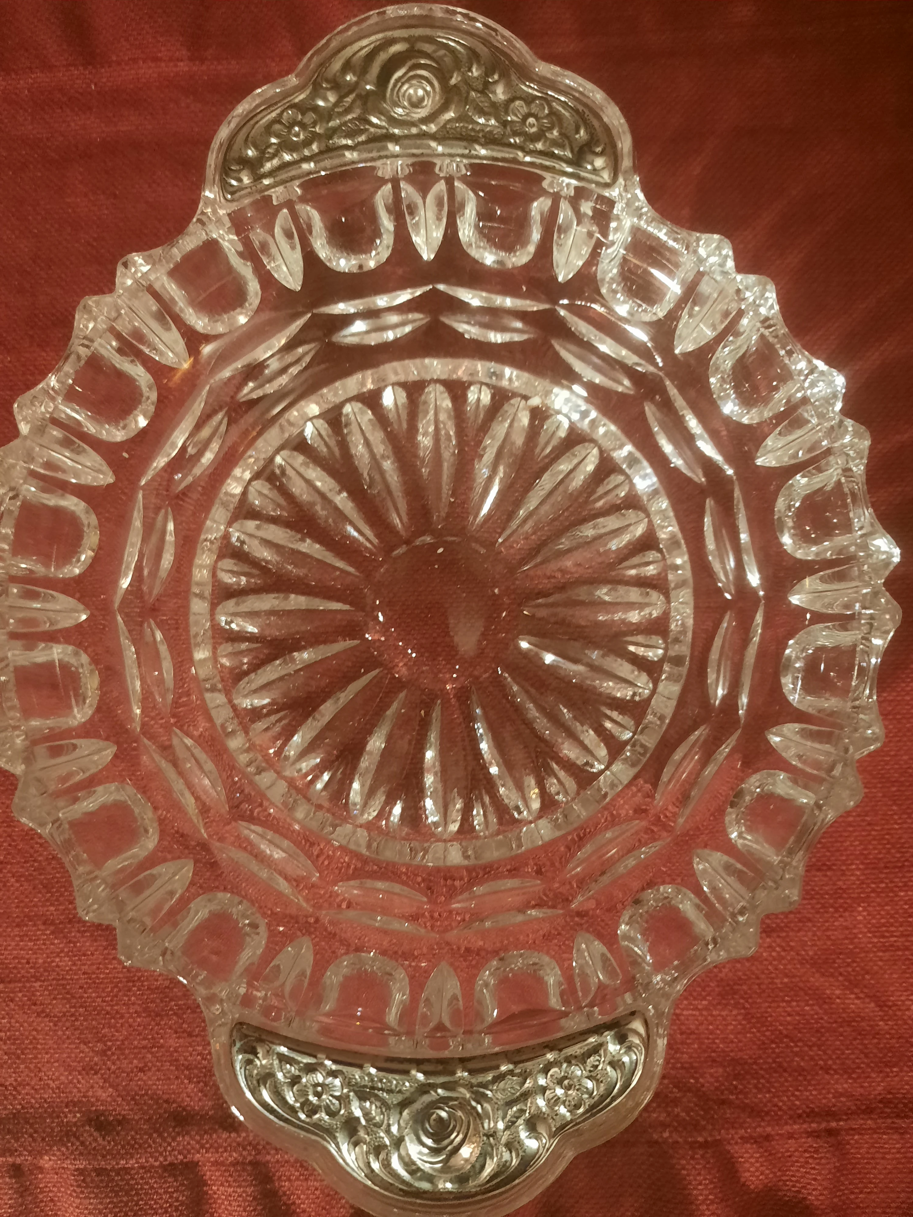 Drei Bleikristall Konfektschalen, 2 davon auch für z.B. Butter nutzbar, mit Griffen mit silberner Auflage, Größe der rechteckigen Schalen innen ca. 12,5 x 8,5 cm innen, Durchmesser der runden Schale ca. 12 cm, 10 Euro