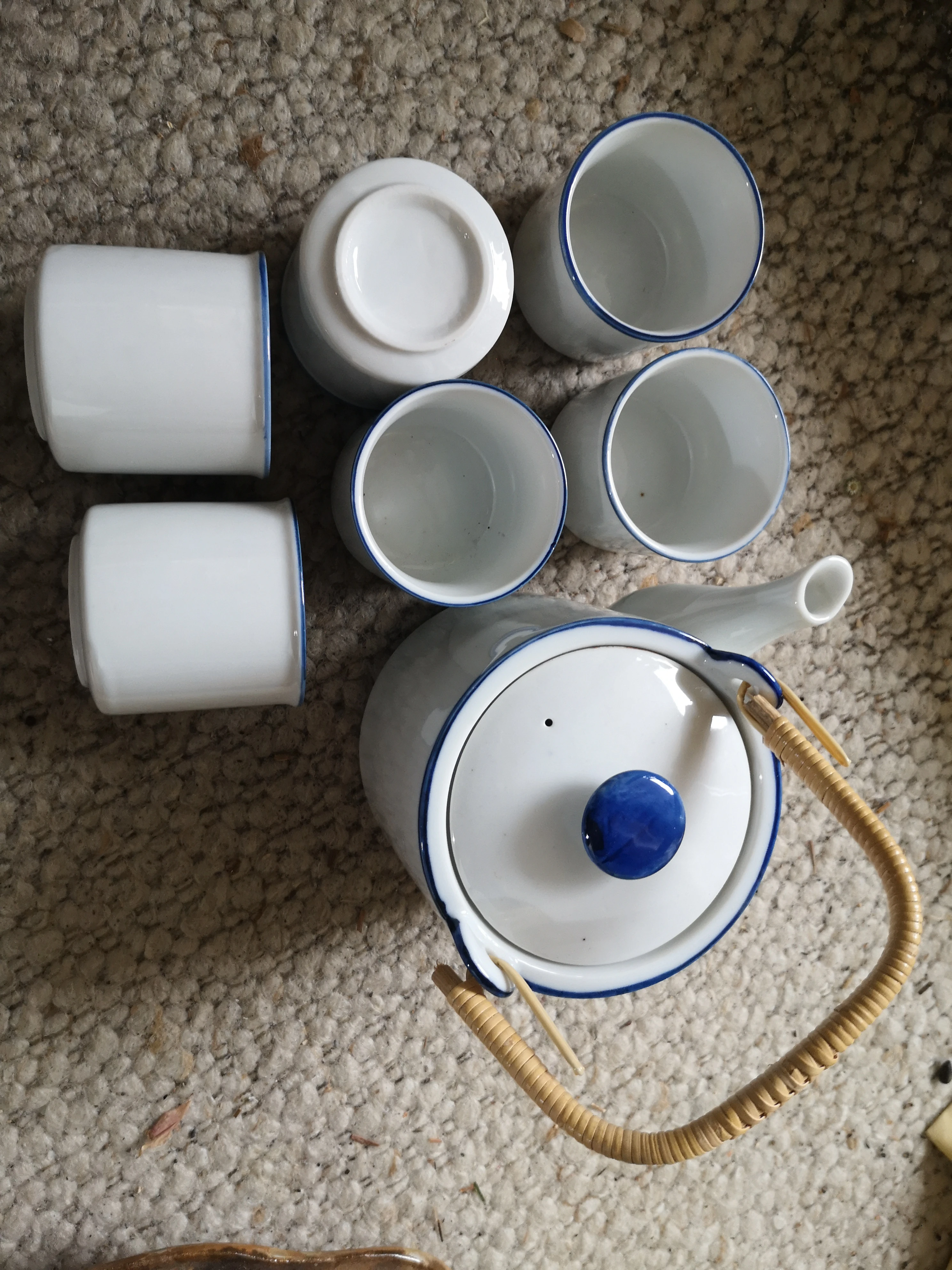 ich verkaufe hier ein niedliches Teeservice aus den 80ern mit Rattanhenkel, selten benutzt. Kanne ohne Henkel ca. 11 cm hoch, Becher 7 cm hoch und 7 cm Durchmesser – siehe Bilder.
