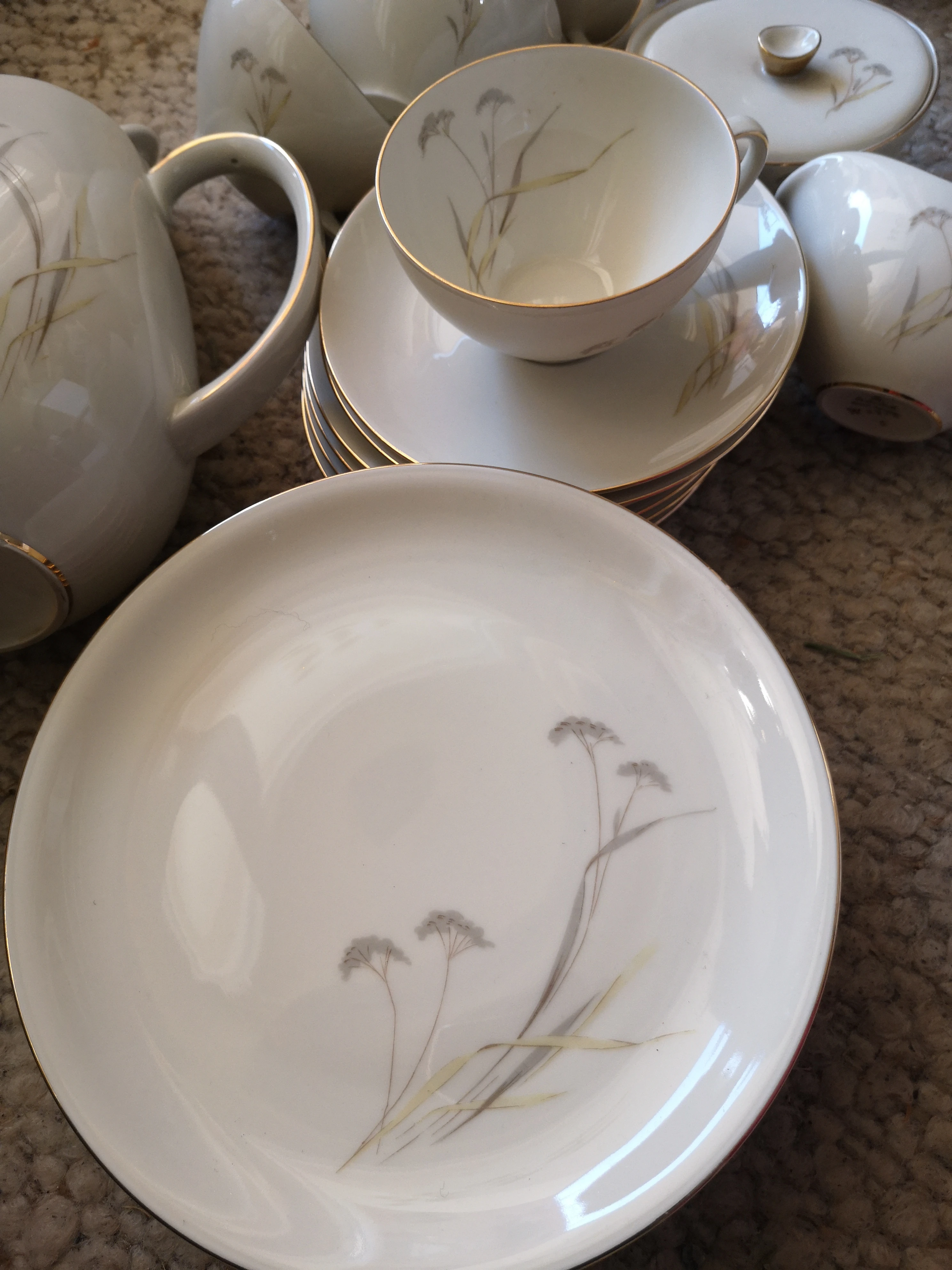 ich verkaufe ein schönes, schlichtes, elegantes Teeservice im Art Deco Stil, W 3522, komplett für 6 Personen mit Kanne, Zuckerdose und Milchkännchen. Helles Elfenbein mit zartem Gräsermotiv und zartem Goldrand, stand nur in Vitrine, keine Beschädigungen, sehr guter Zustand, fast wie neu. Auch einzelne Gedecke (Kuchenteller, Untertasse, Tasse) je 5 Euro, Kanne einzeln 8 Euro, Milch und Zucker-Set 8 Euro,