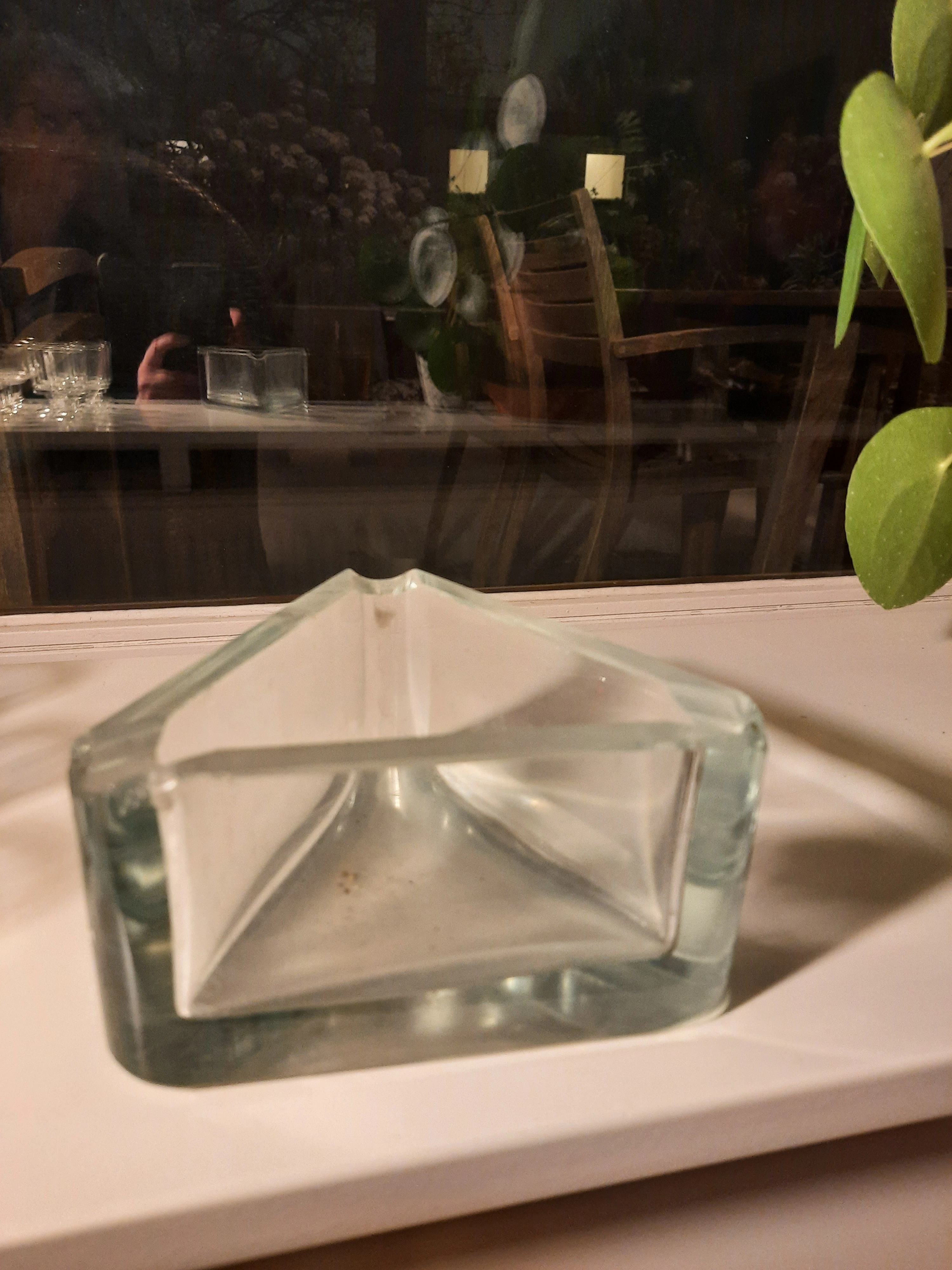 Schwerer, gleichschenkliger Glasaschenvecher, je Seitenlänge ca. 15 cm, Höhe ca. 10 cm. Drei Ablagen für Zigaretten. An den Ecken tlw etwas abgeschlagen Glassplitter, 5 Euro