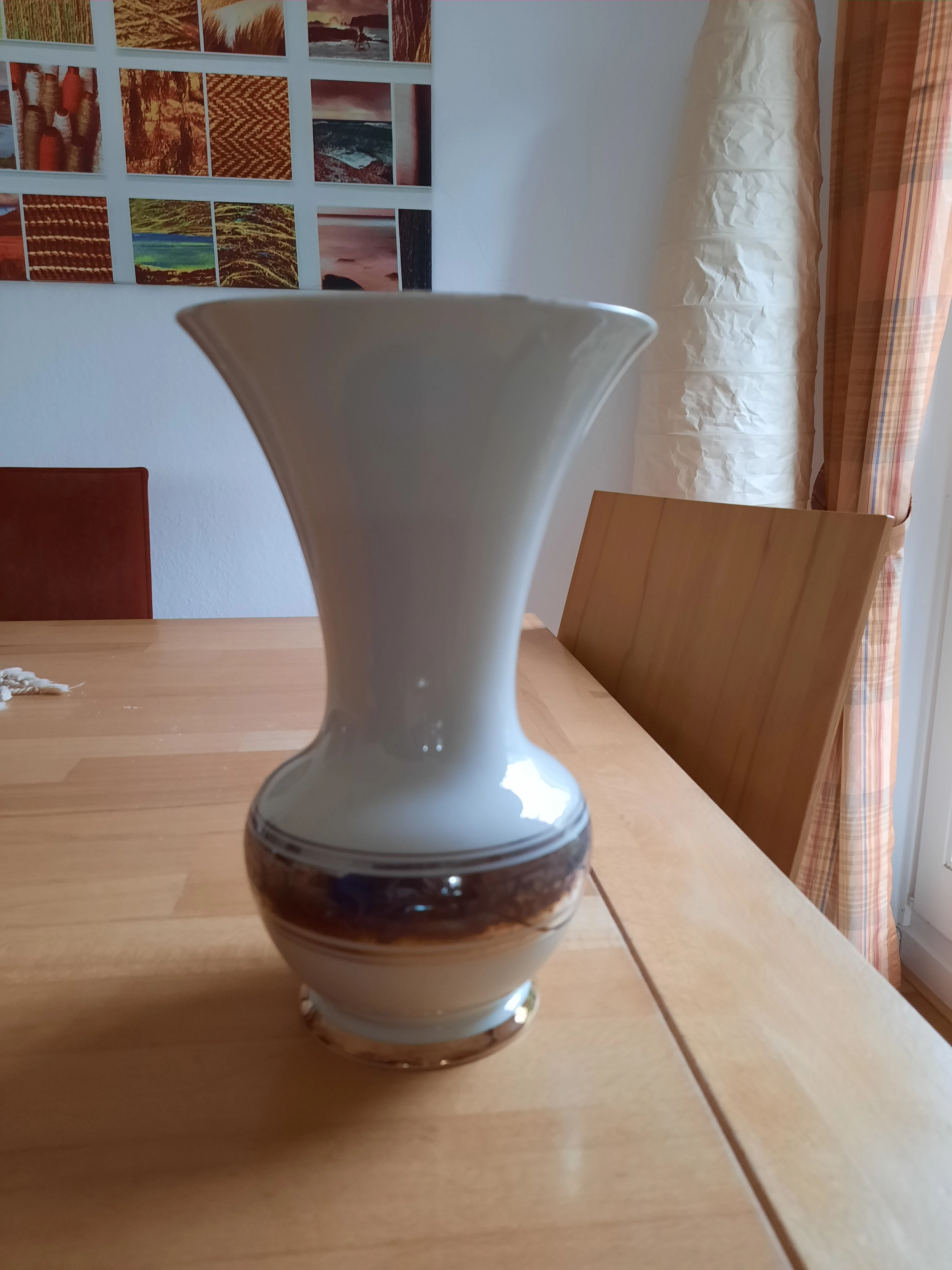 Die Vase ist beige glasiert, mit einem braunen Dekorband im unteren bauchigen Bereich und goldenen Akzenten an Rand und Fuß. 15 Euro