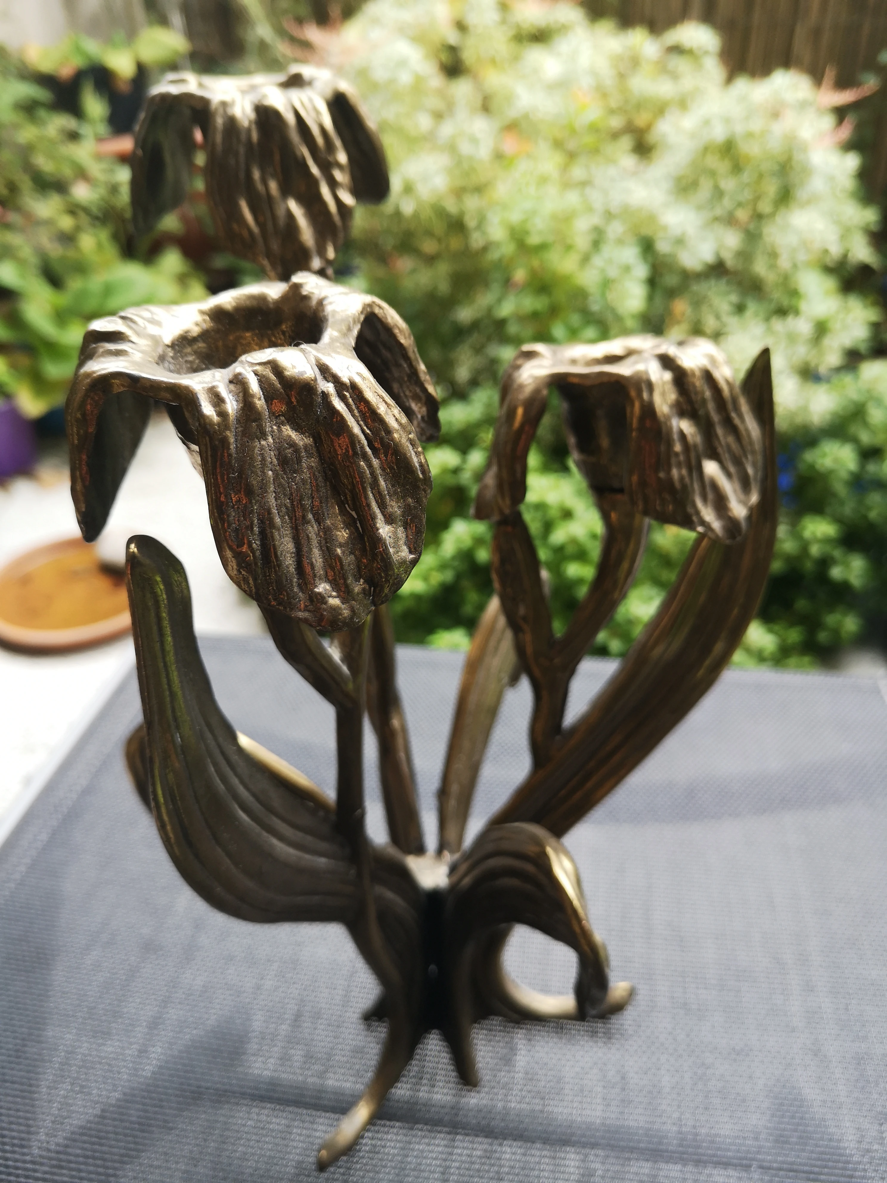zum Verkauf steht dieser hübsche Messing (Bronze?) Kerzenständer, massiv, im Art Deco / Jugendstil, 3 Lilien, also 3flammig. Antonella Saviato? Evtl. aus den 60ern, Brutalist. Höchste Lilie 29 cm, niedrigste 24 cm, ca. 1,8 kg schwer. Finde ihn nach wir vor sehr schön, passt nur nicht mehr in meinen Einrichtungsstil. Siehe Bilder – NUR Abholung in der Neustadt.