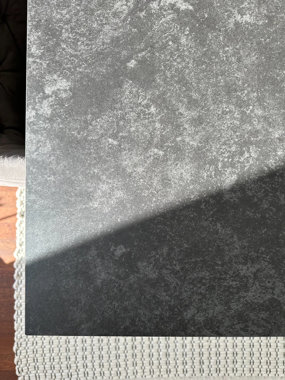 Der Tisch hat eine Glas Keramikplatte und ist dadurch sehr robust und gut abwischbar. Die Füße sind aus Metall. Die Maße des Tisches ist: 90cm breit, 160cm lang, 75cm hoch . Der Tisch stammt aus dem Möbelhaus Flamme und steht in einem Nichtraucher-Haushalt. Weitere Fragen beantworte ich gerne über eine persönliche Nachricht.