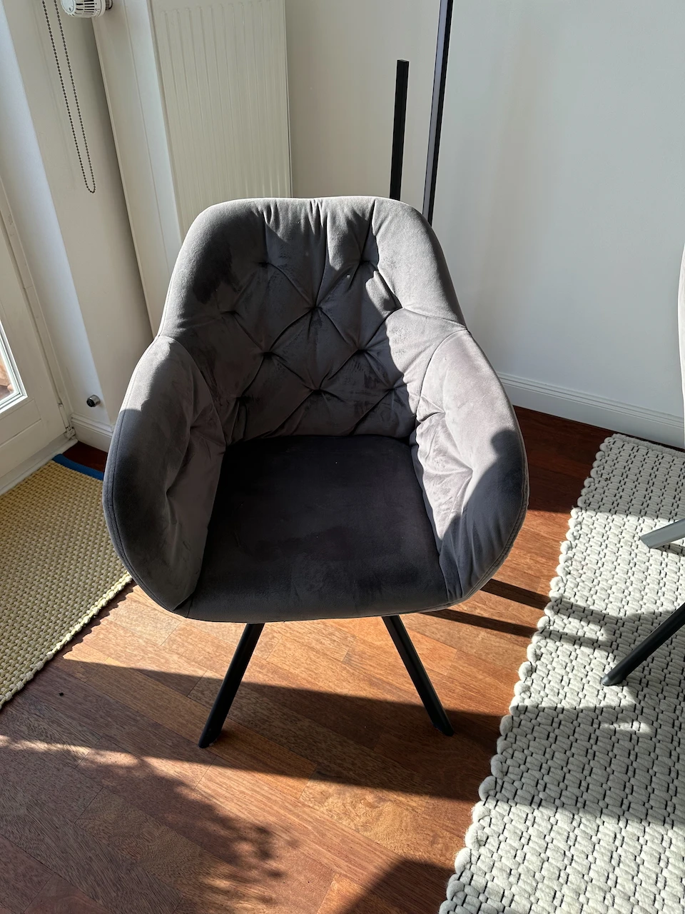 Die Stühle haben einen dunkelgrauen Stoffbezug und einen schwarzen Kegelfuß aus Metall. Die vorhandene Drehfunktion sorgt dafür, dass der Sitz sich immer in seine Ursprungsposition zurückdreht.