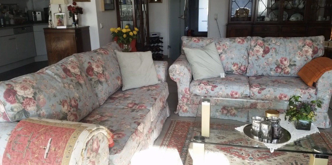 Für das Sofa habe ich noch zwei geblümte Bezüge. Außerdem gibt es noch passende kleine Kissen dazu.
