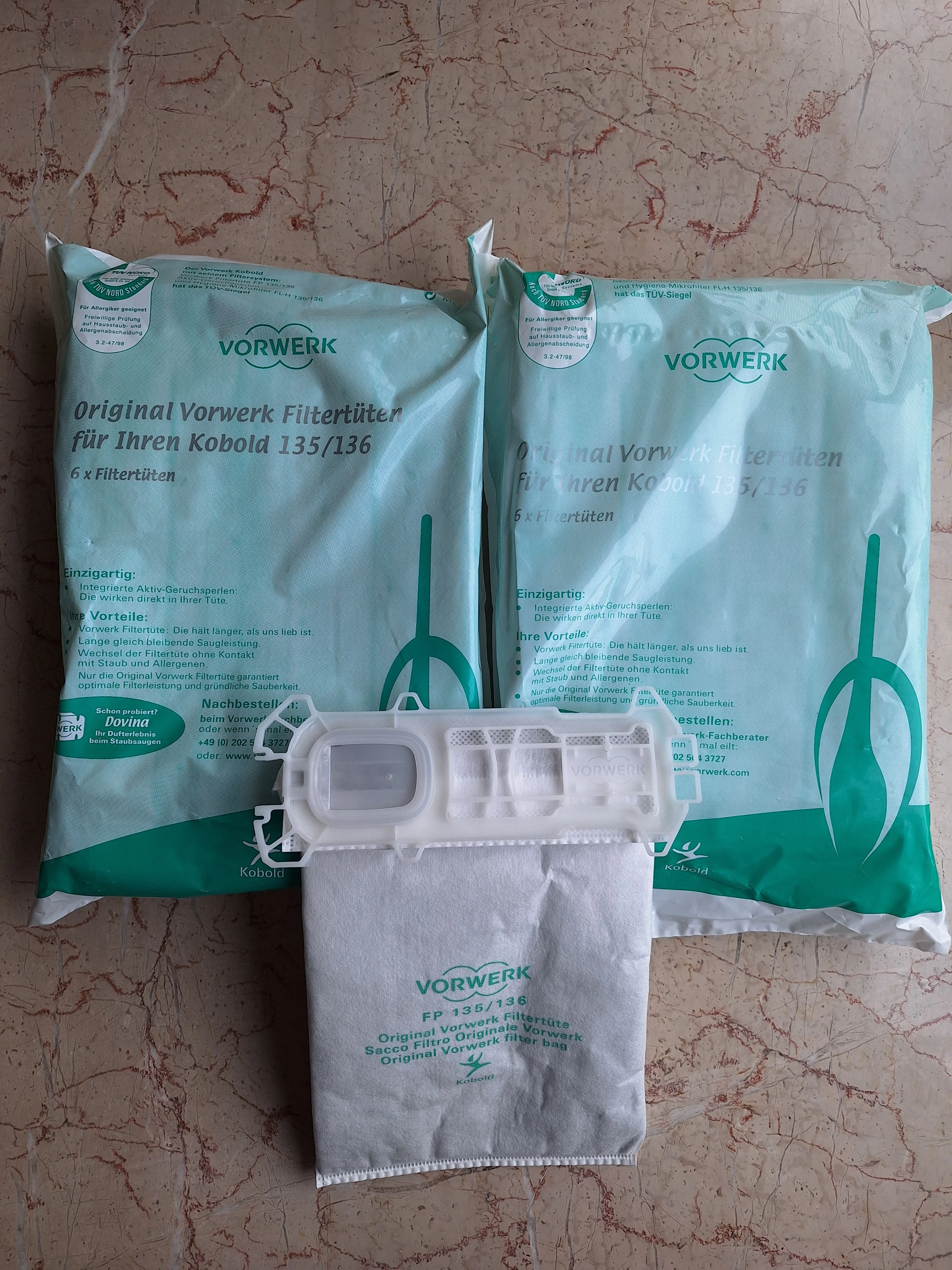 Original verpackte Filtertüten für VORWERK Staubsauger, insgesamt 14 Stück. 2 × 6 Stück verpackt plus 2 lose. Preis im Handel 23 € je 6 Stück.