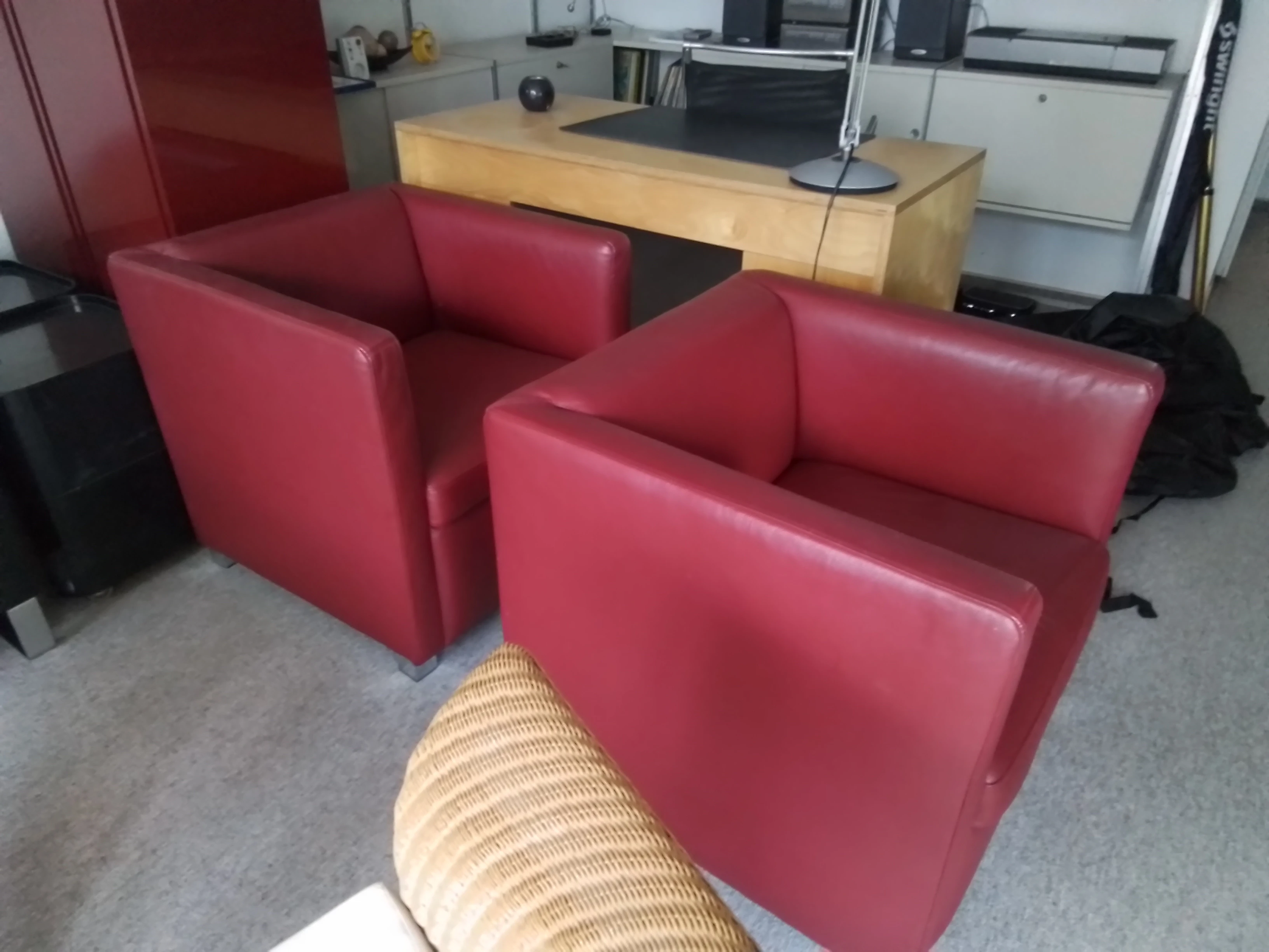 Biete 2 rote Ledersessel (echtes Leder) geeignet für Wohnzimmer, Empfangs- Wartezimmer. Maße B 66, H 67, T 68 cm. Fuß: Chrom. Preisvorstellung 60,00 € für einen Sessel, für beide Sessel 100 00 €.