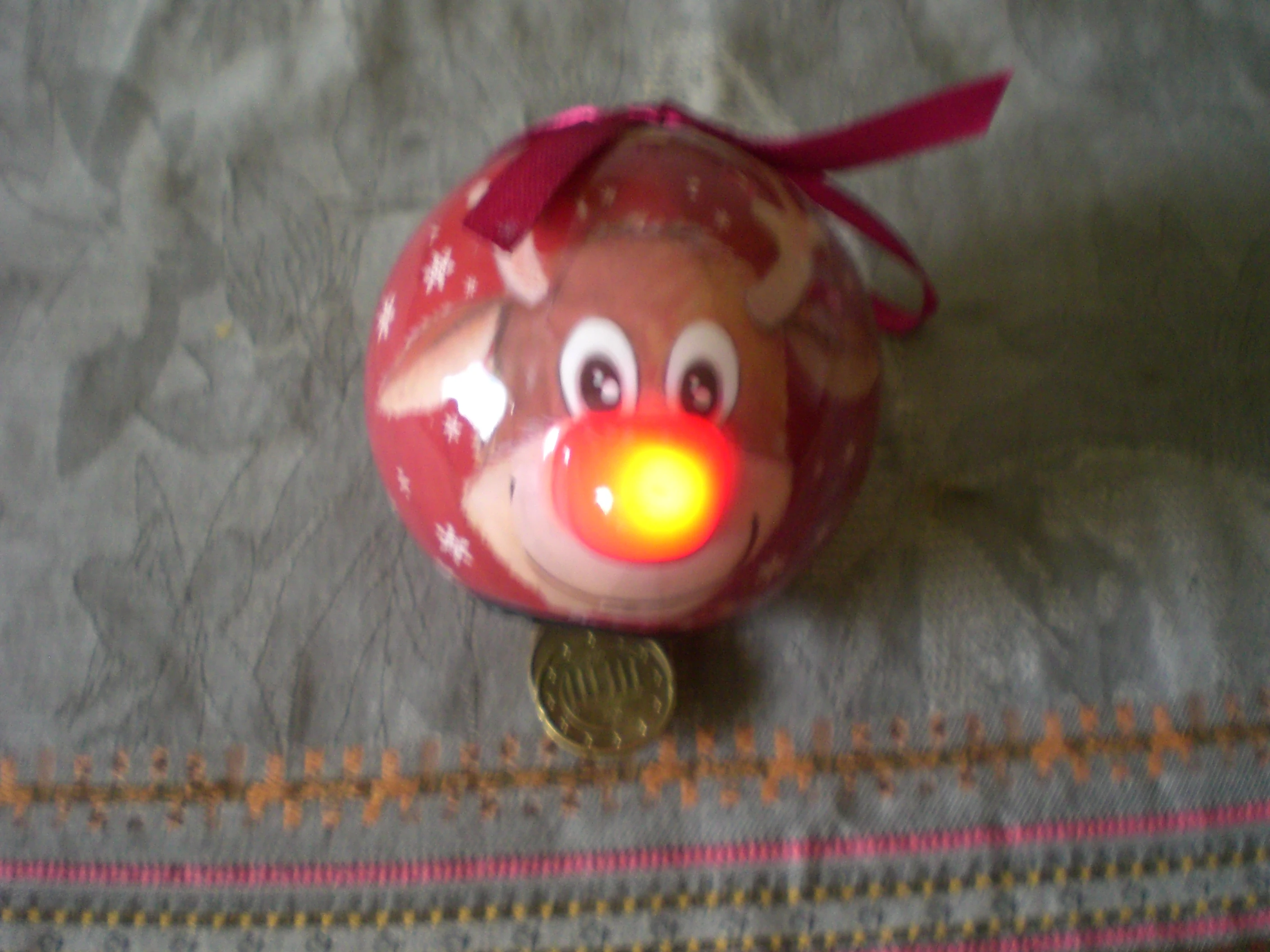 Die Kugel wird mit LED betrieben, wenn man sie einschaltet, dann blinkt die Nase vom RENTIER