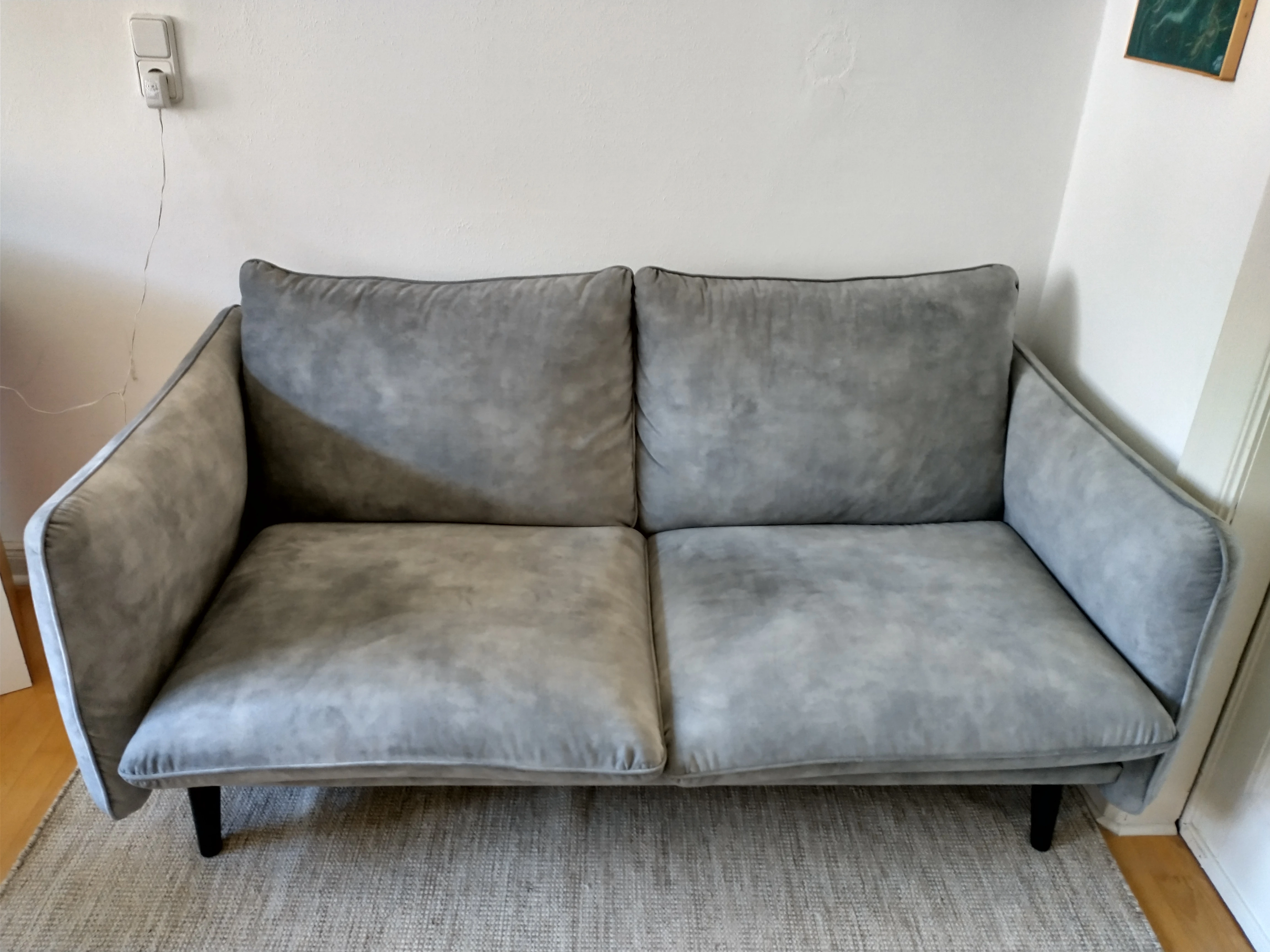 Elegantes neuwertiges Zweisitzer Sofa, grauer Samtstoff, L 1,60, T 0,90, H 0,70 für 100 Euro plus Sessel umsonst abzugeben. Tel.: 04941352236.