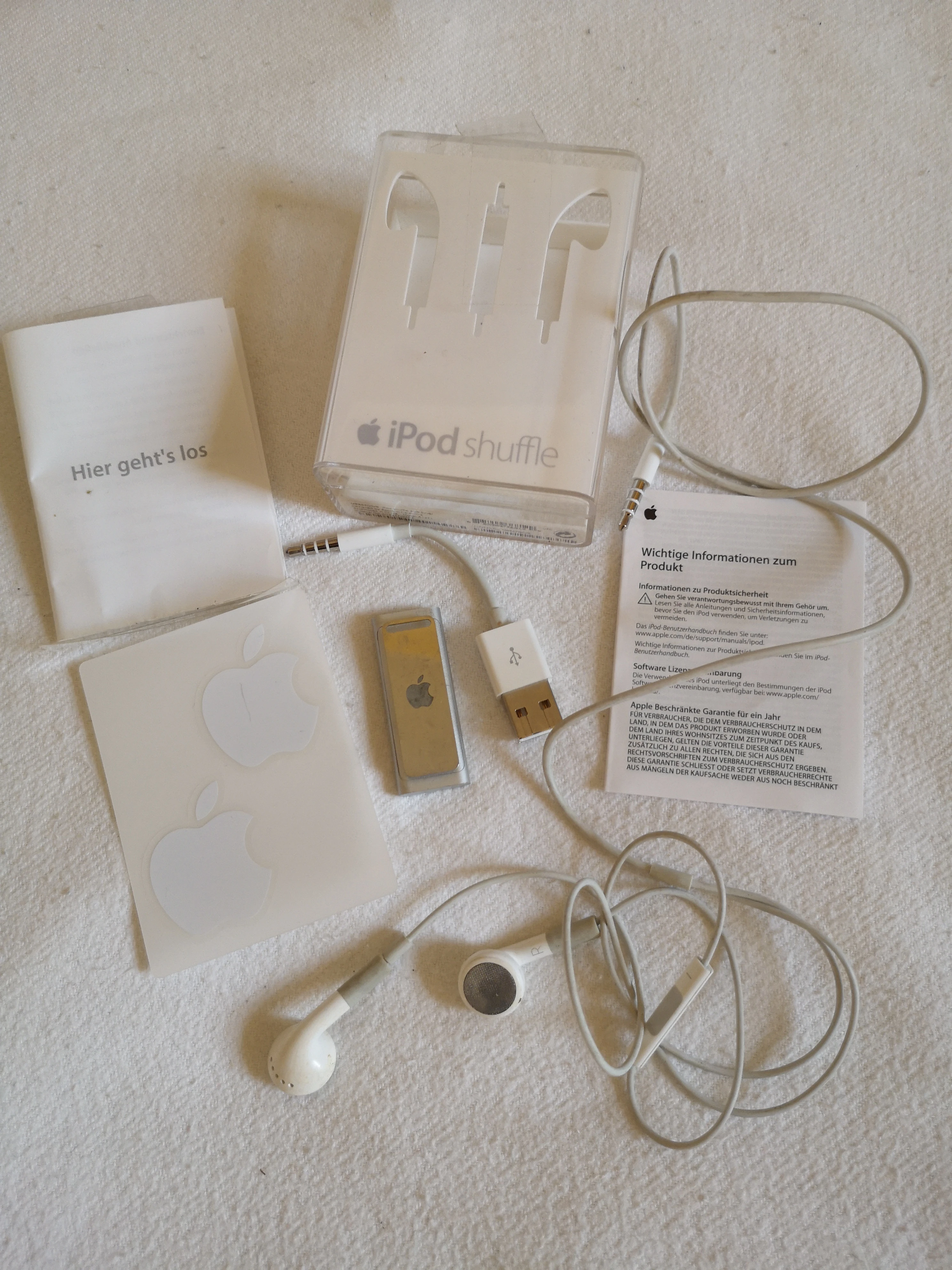 zu verkaufen ist ein iPod shuffle Modell A1271 4GB in silber mit original Kopfhörern und original Verpackung, Bedienungsanleitung, nur sehr sehr wenig benutzt, bevor er in die Schublade kam für die letzten Jahre – Funktion nicht erneut geprüft. Daher erfolgt der Verkauf unter Ausschluss jeglicher Sachmängelhaftung, Gewährleistung und Garantie, da Privatverkauf. Siehe Bilder – nur Abholung in der Neustadt