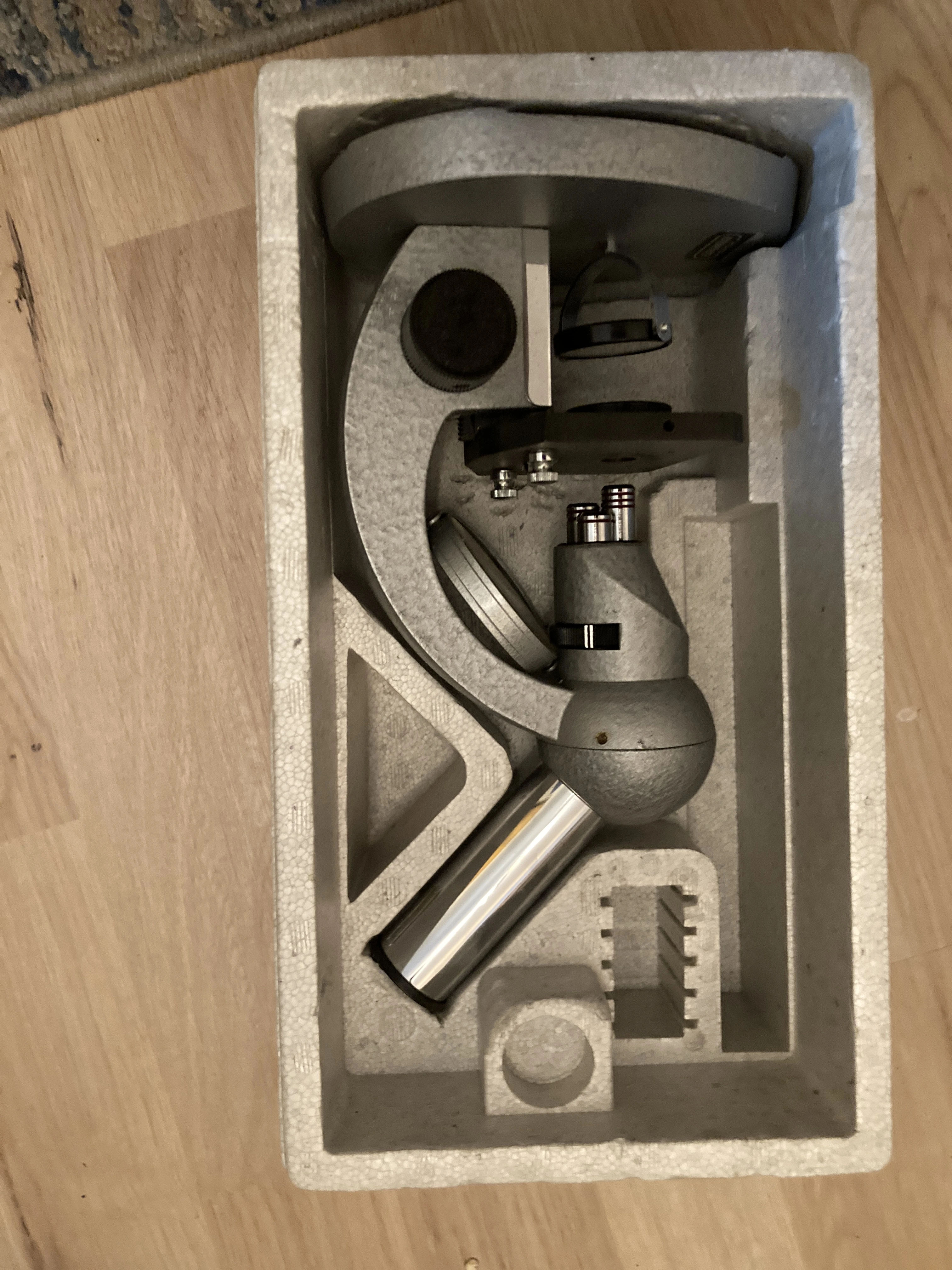 biete hier ein kleines Mikroskop an, Größe: 23 cm, Lichtquelle erfolgt durch Licht auf einem Spiegel. Ohne weiteres Zubehör.