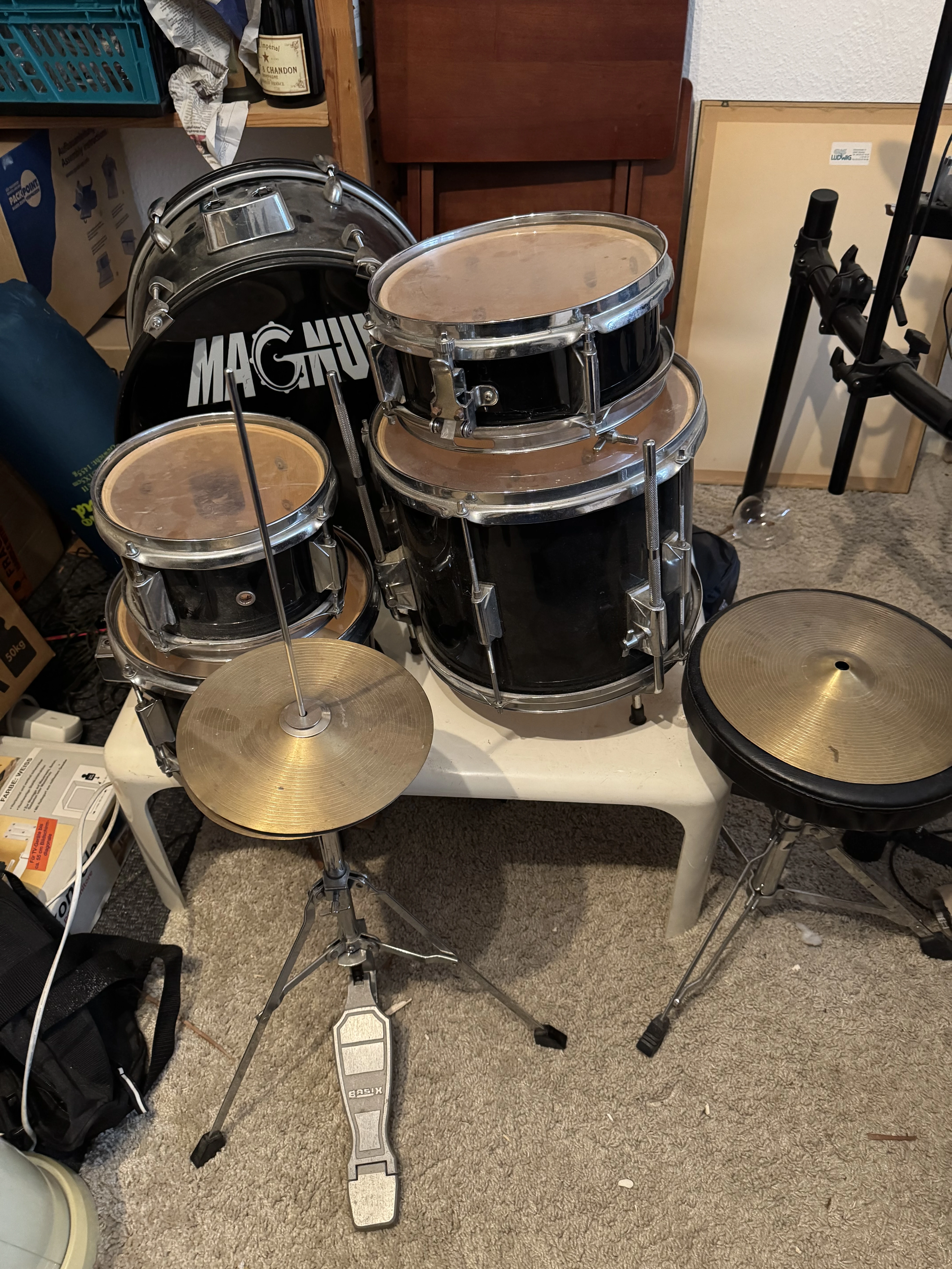 Kinderschlagzeug von Magnum. alle Teile vorhanden. War lange nicht aufgebaut. Auf dem Foto fehlt die Fußmaschine und andere kleine Teile. Die sind aber vorhanden.