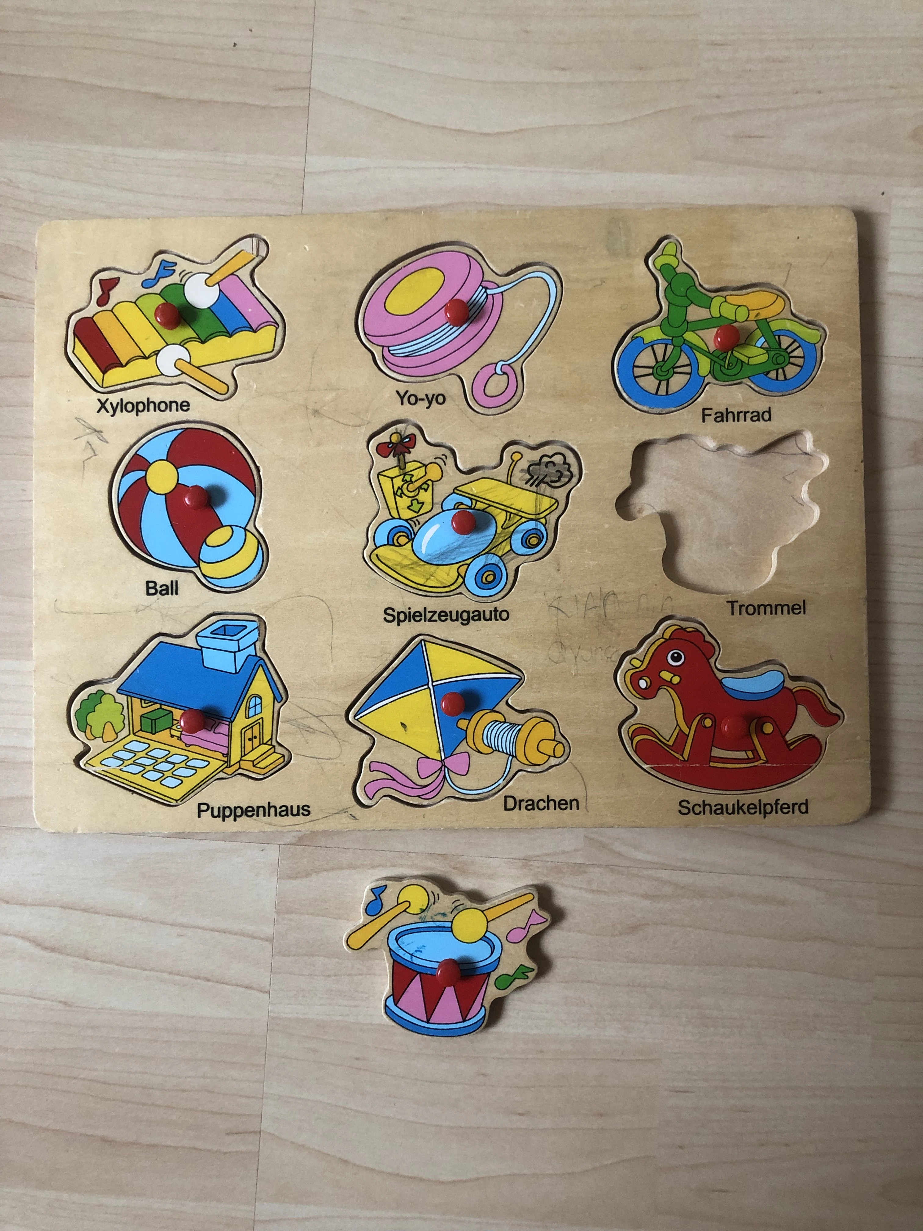 Für die ersten Puzzle-Versuche. Mit dem liebevoll gestalteten Steckpuzzle-Set können sich jetzt auch die Kleinsten an das Puzzeln wagen. Die Motive werden die Kinder begeistern und mit viel Freude beschäftigen. Die einzelnen bunten Teile haben jeweils einen Holzknopf auf der Oberseite, damit die Teile gut greifbar für kleine Kinderhände sind. Das Herausnehmen und Einsetzen der Teile geht leicht und problemlos. Förderung der Grob- und Feinmotorik sowie die Auge-Hand-Koordination. Ist über lange Zeit ein viel bespieltes Holzspielzeug. Maße: ca. 30 x 23,5 cm, ab 12 Monaten. Dieses tolle Lernspielzeug sucht jetzt einen liebevollen Neubesitzer und ist ein kostbarstes Geschenk für Ihr Kind bzw. Enkelkind, für Freunde und Familie. Unbeschädigter Artikel in gutem Zustand, Privatverkauf, siehe Fotos, Tierfreier Nichtraucherhaushalt! Neupreis 19,95€/Stück jetzt nur 8€/Stück oder beide zusammen nur 13€, Versand (€ 3,00) bei Kostenübernahme möglich