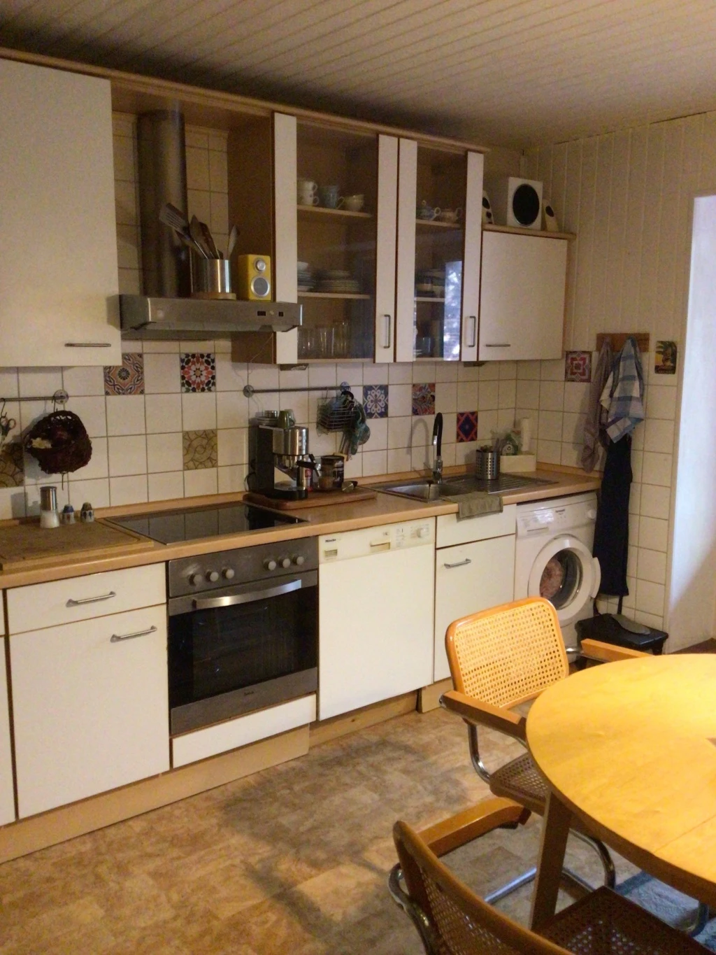Ein Zimmer + Gemeinschaftsbereich. Die Kinder sind aus dem Haus und für mich alleine ist es zu groß. Das Haus besticht durch seine Helligkeit, die gemütliche Atmosphäre mit Holzfußboden und -decke. Der geräumige Küchen- Essbereich und das Bad werden geteilt.