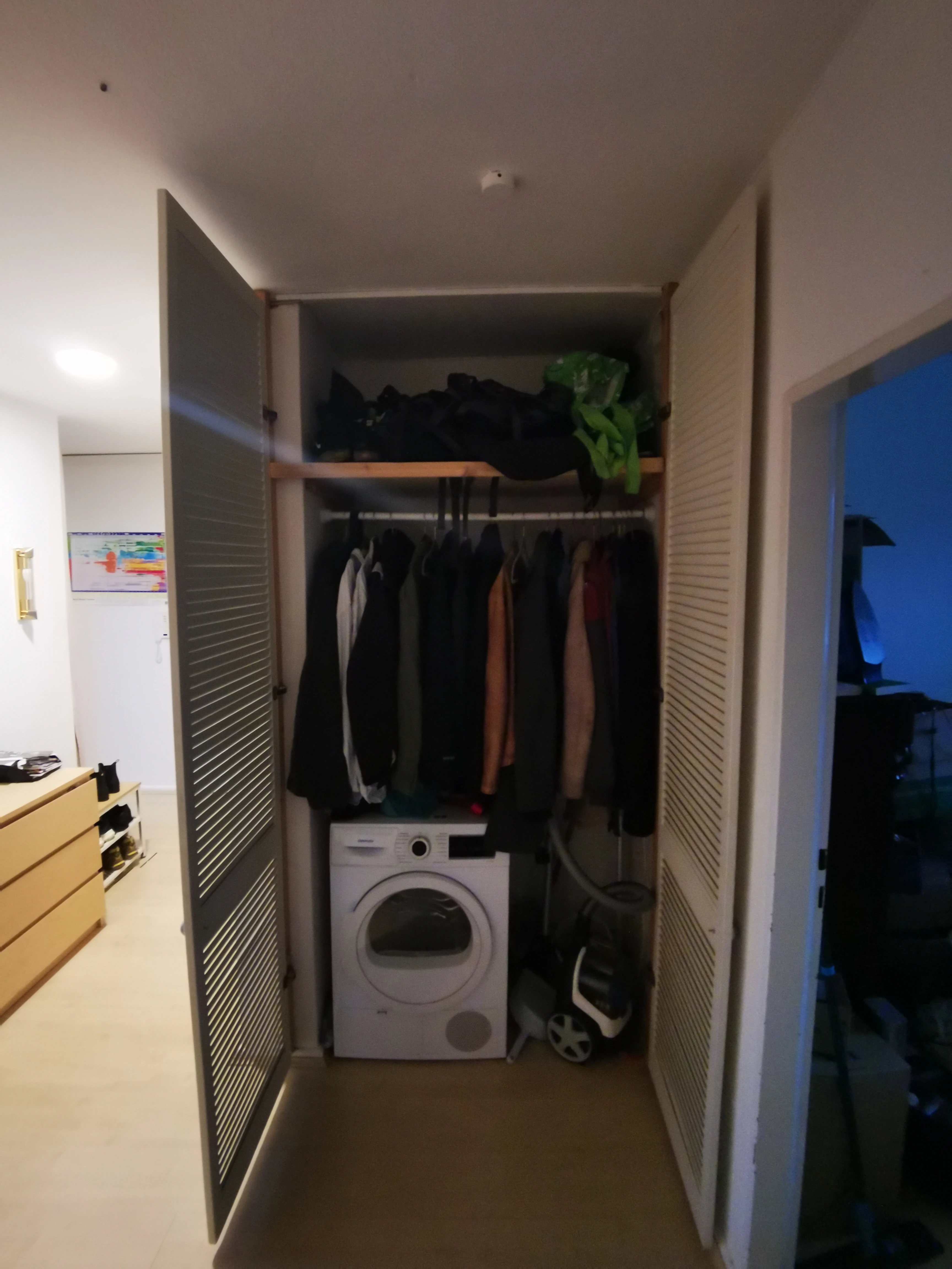 Neben den beiden Hauptzimmern gibt es noch ein drittes, kleineres Zimmer, das als Gästezimmer (ausziehbare Gästecouch, Schreibtisch) bzw. Abstellraum (Wäscheständer, Bügelbrett) genutzt wird. Im Flur ist noch ein Wandschrank, in den ein Trockner passt (Jan nimmt seinen leider mit) und in dem sich auch die Garderobe sowie zusätzlicher Stauraum befindet. In dem kleineren Wandschrank neben dem Bad sind die Waschmaschine (Abschlag), sowie Putzmittel und Haushaltskram untergebracht. Es gibt einen großen Balkon, der gerade frisch renoviert wurde. Ein Kellerabteil ist natürlich auch vorhanden.