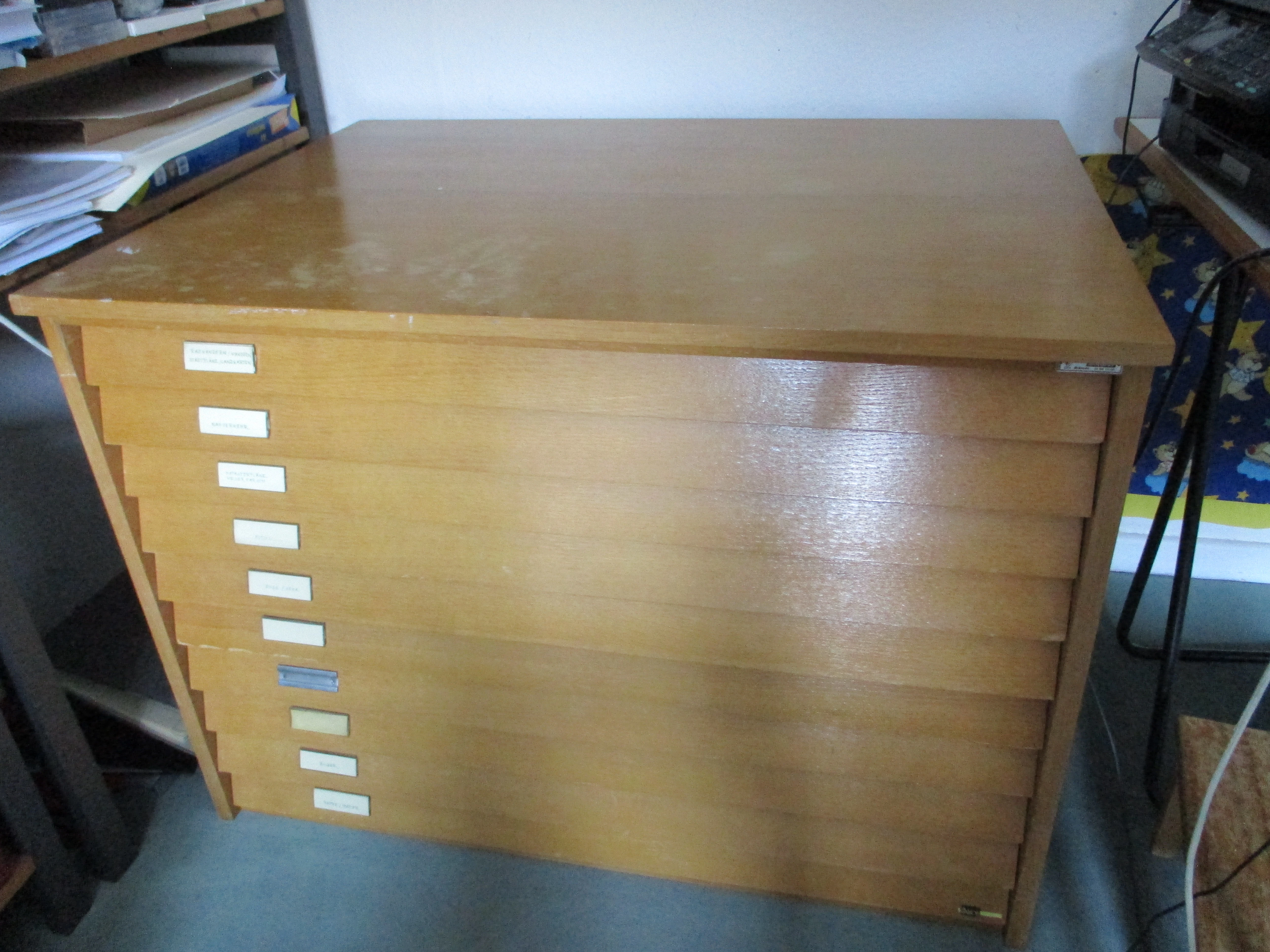 Planschrank mit 10 Schubladen. Geeignet für Pläne, Grafiken, Zeichnungen bis zu 75x100 cm. Höhe 75 cm.